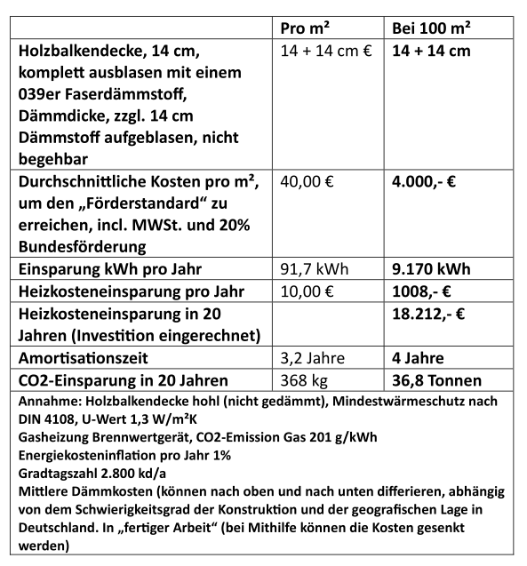 Wärmeschutz: Beträgt der U-Wert der oberen Geschoßdecke vorher ca. 1,3 W/m²K, so kann er durch die Dämmmaßnahme auf ca. 0,14 W/m²K gesenkt werden. Dies bedeutet eine wärmetechnische Verbesserung des Bauteils „obere Geschoßdecke“ um ca. 90 %. Die Heizkosten eines eingeschossigen Gebäudes können um bis zu 20% sinken. Bei mehrgeschossigen Gebäuden sinkt der prozentuale Einspareffekt.